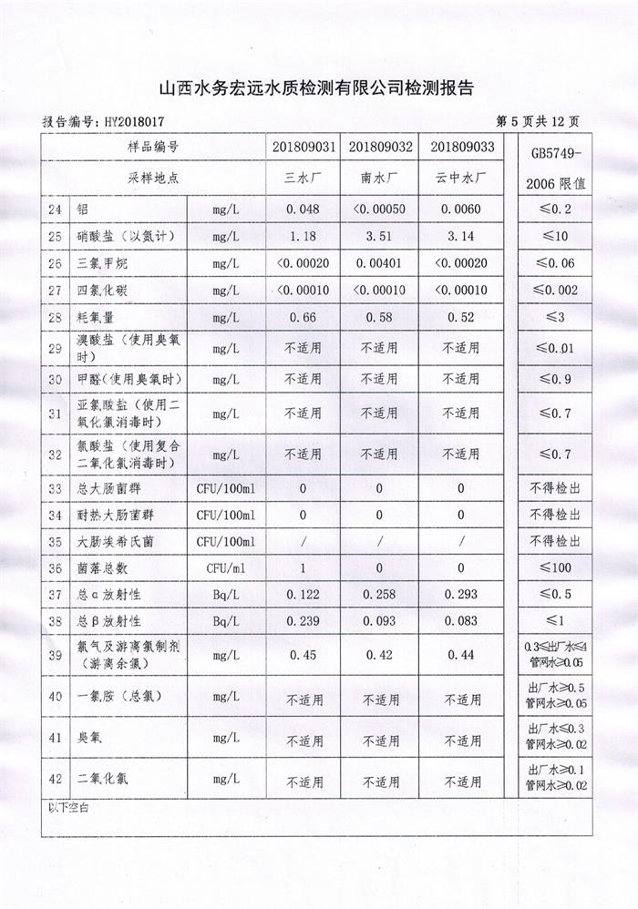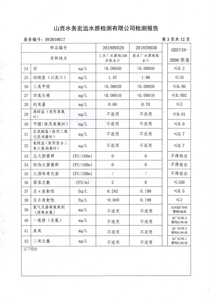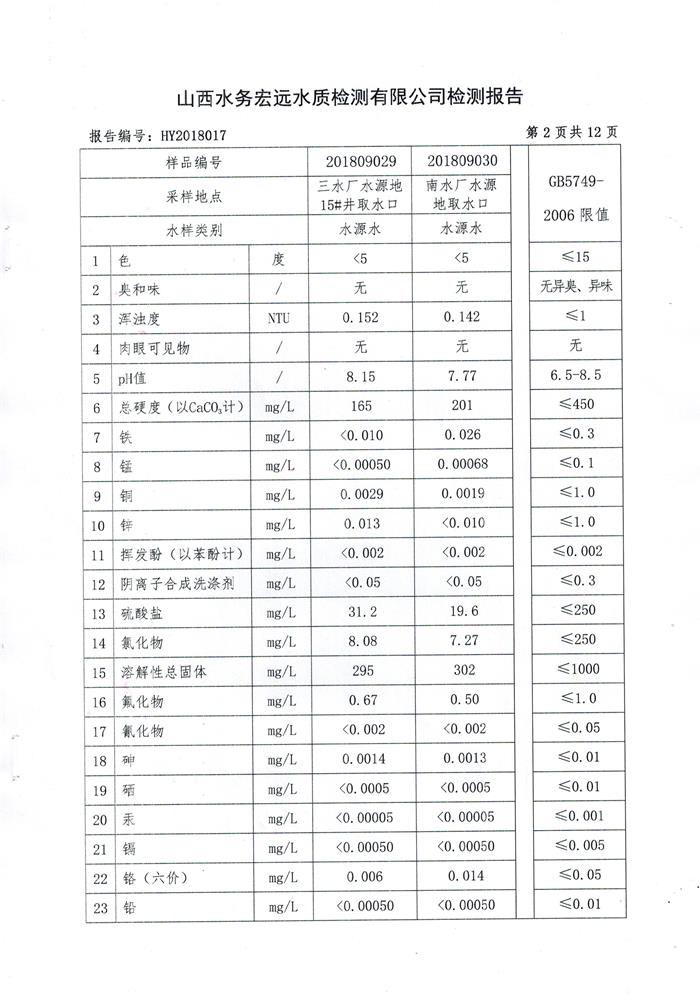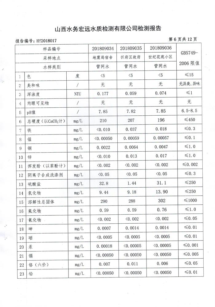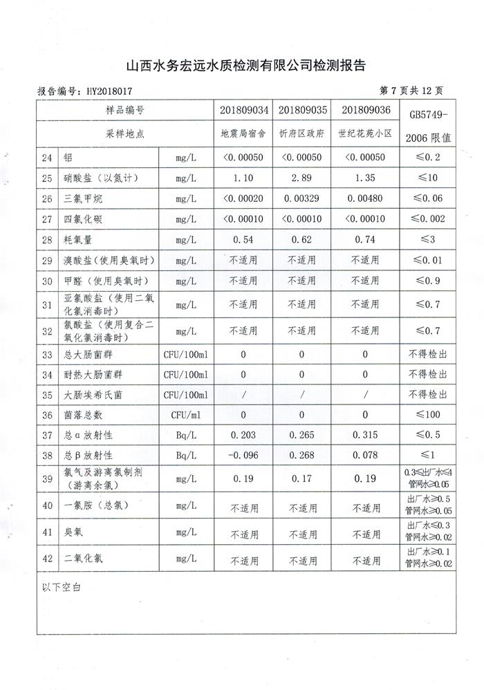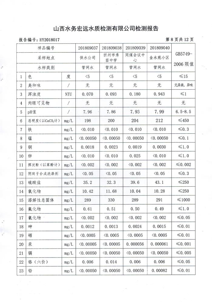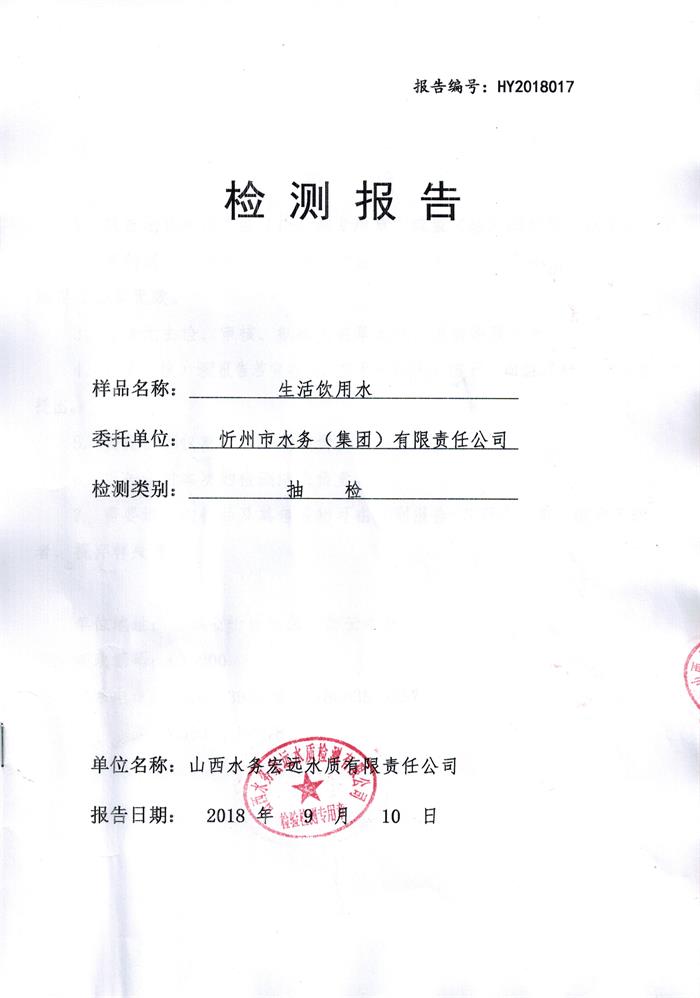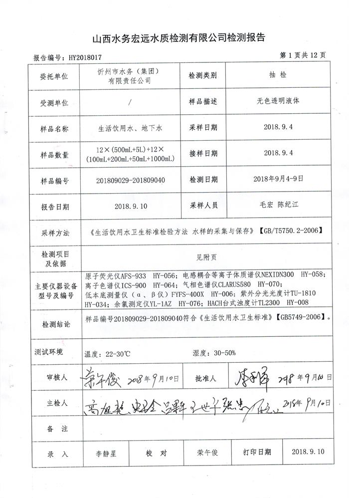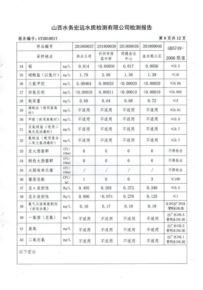 忻州城區(qū)公共供水水源水、出廠水、管網(wǎng)水、管網(wǎng)末梢水2018年9月份水質信息公示