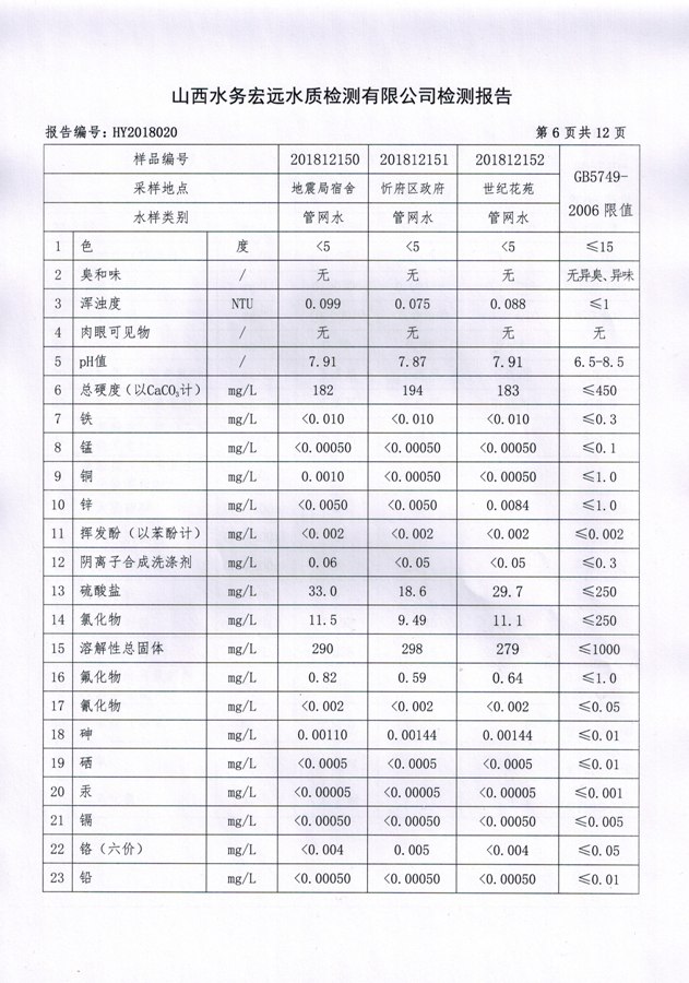忻州城區(qū)公共供水水源水、出廠水、管網(wǎng)水、管網(wǎng)末梢水2018年12月份水質(zhì)信息公示