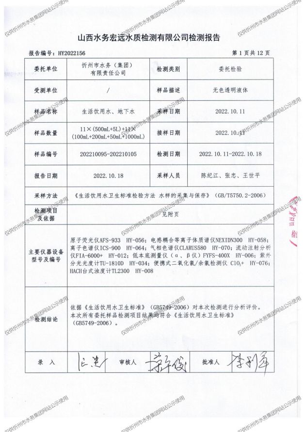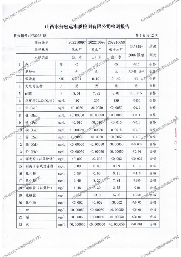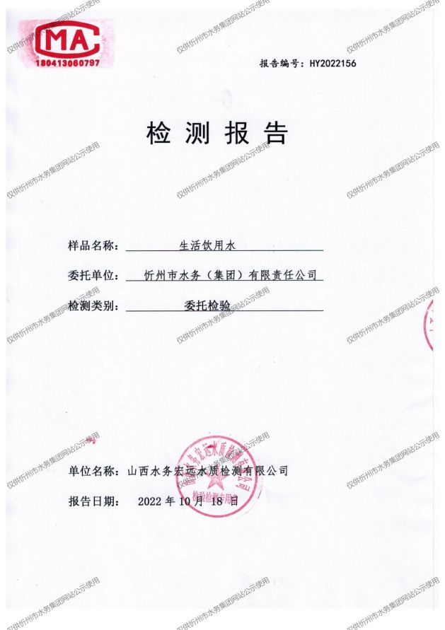 忻州城區(qū)公共供水水源水、出廠水、管網(wǎng)水、管網(wǎng)末梢水2022年10月份水質信息公示