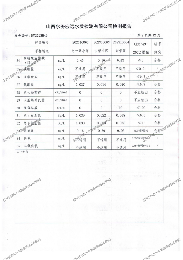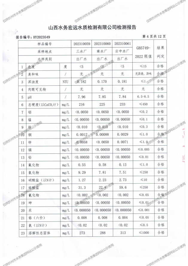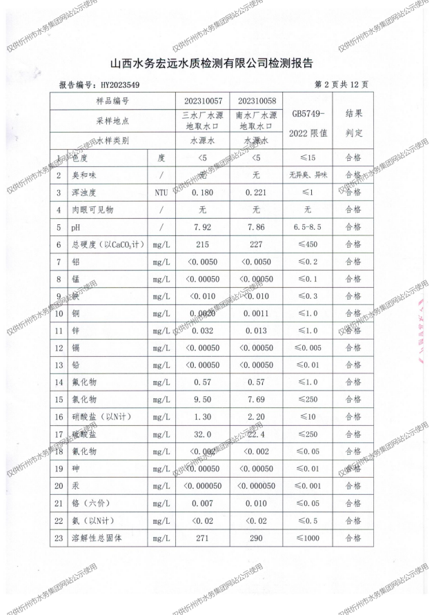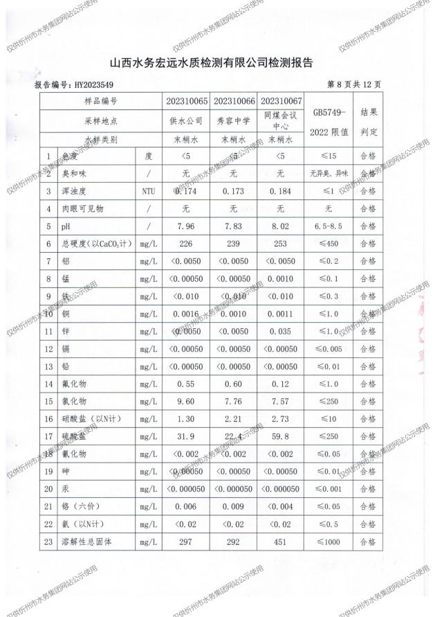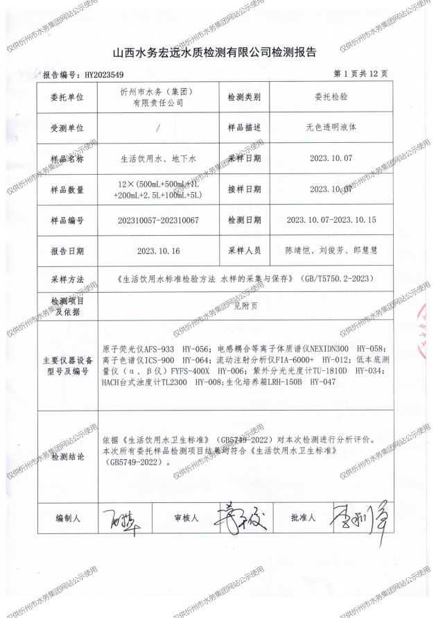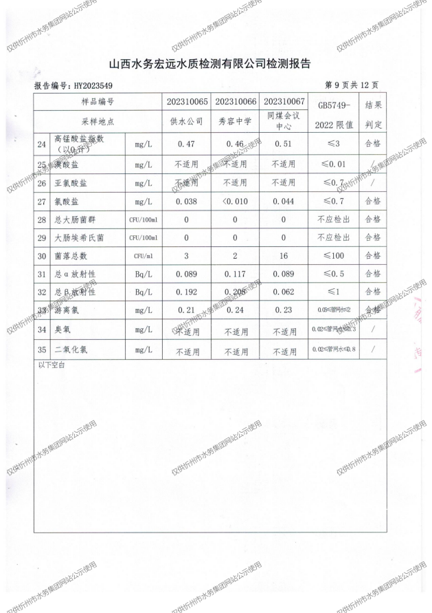 忻州城區(qū)公共供水水源水、出廠水、管網(wǎng)水、管網(wǎng)末梢水2023年10月份水質信息公示