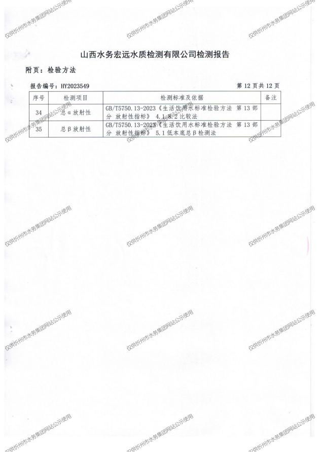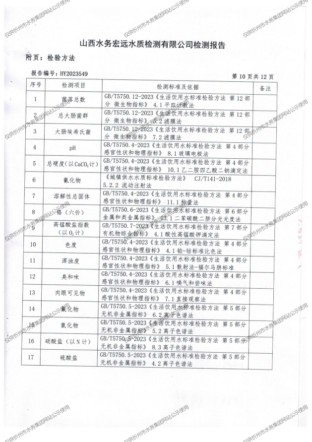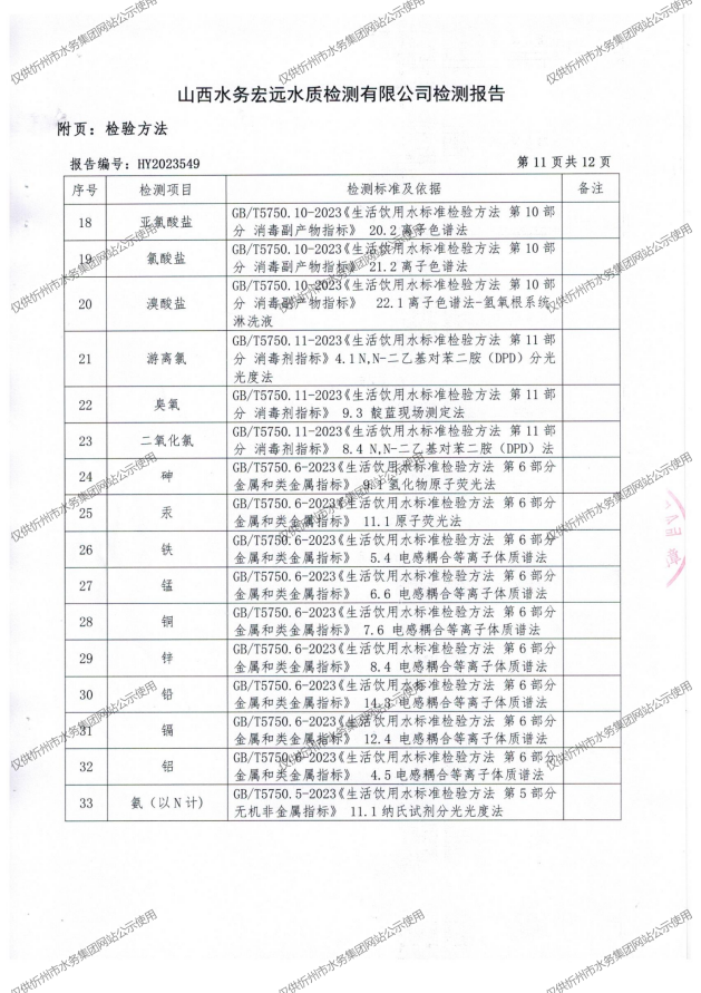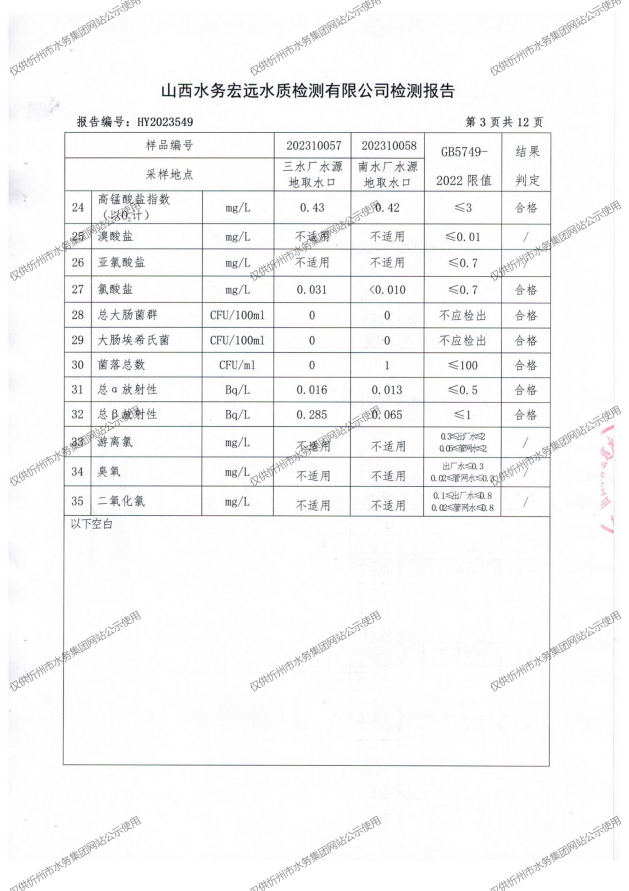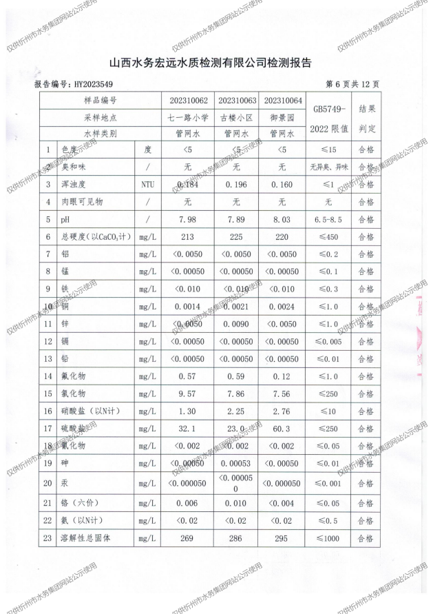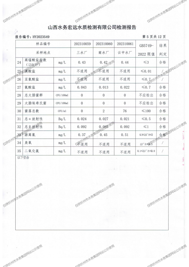 忻州城區(qū)公共供水水源水、出廠水、管網(wǎng)水、管網(wǎng)末梢水2023年10月份水質信息公示